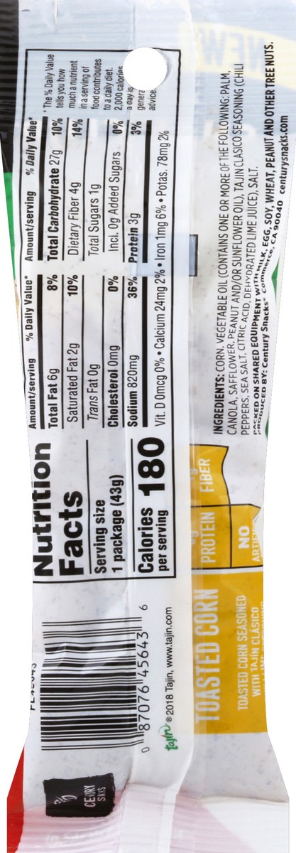 Corn (Corn, Canola Oil, Sea Salt), Tajin Clasico Seasoning (Chili Peppers, Sea Salt, Citric Acid, Contains 0.5% or Less of Dehydrated Lime Juice, Silicon Dioxide [to Prevent Caking]), Canola Oil.