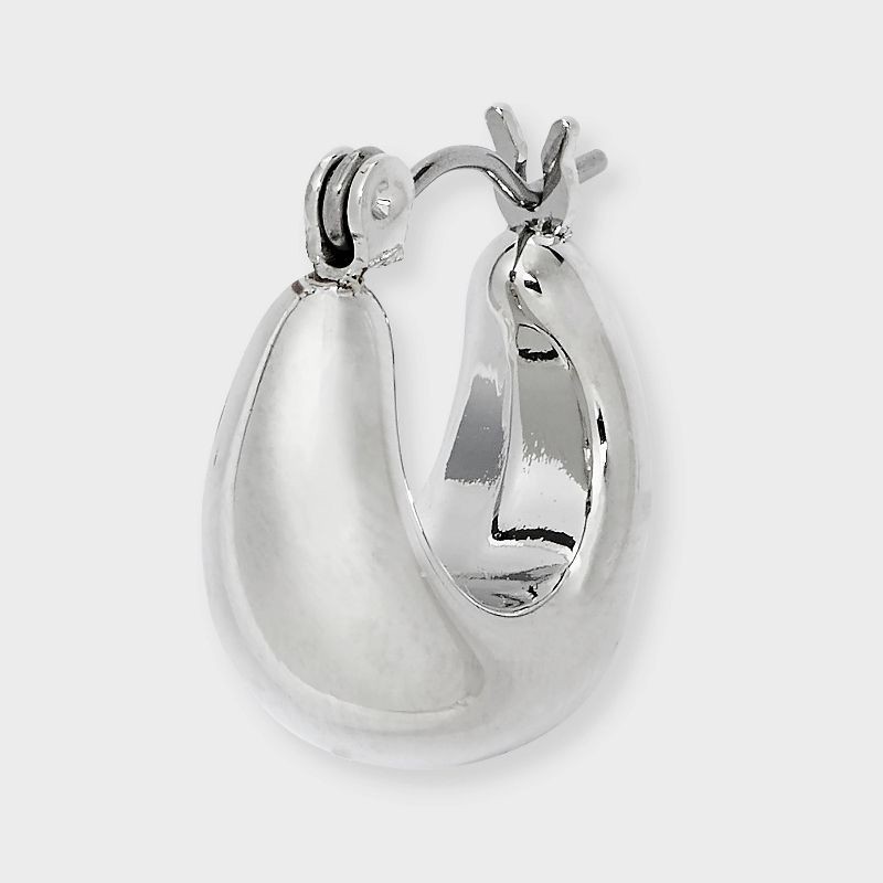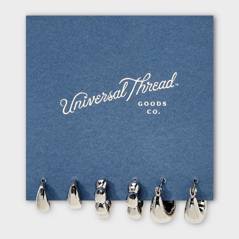 Glam up your everyday look with these 3-Piece Hoop Earring Set from Universal Thread™. This set includes three pairs of hoop earrings featuring bubble, curved and cushion design in silver-tone finish …