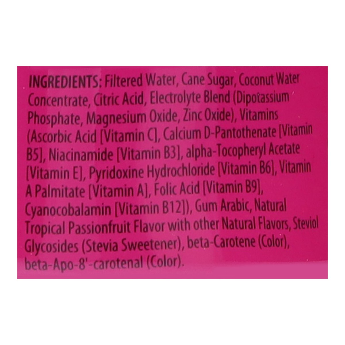 Filtered Water, Cane Sugar, Coconut Water Concentrate, Citric Acid, Electrolyte Blend (Dipotassium Phosphate, Magnesium Oxide, Zinc Oxide), Vitamins (Ascorbic Acid [Vitamin C], Calcium D-Pantothenate …