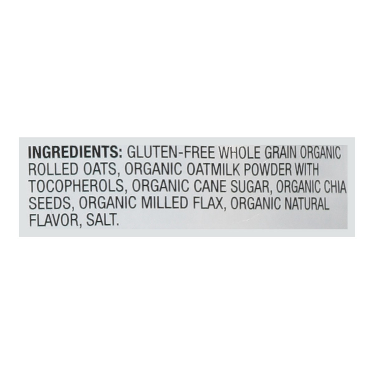 Gluten-Free Whole Grain Organic Rolled Oats, Organic Oatmilk Powder with Tocopherols, Organic Cane Sugar, Organic Chia Seeds, Organic Milled Flax, Organic Natural Flavor, Salt.