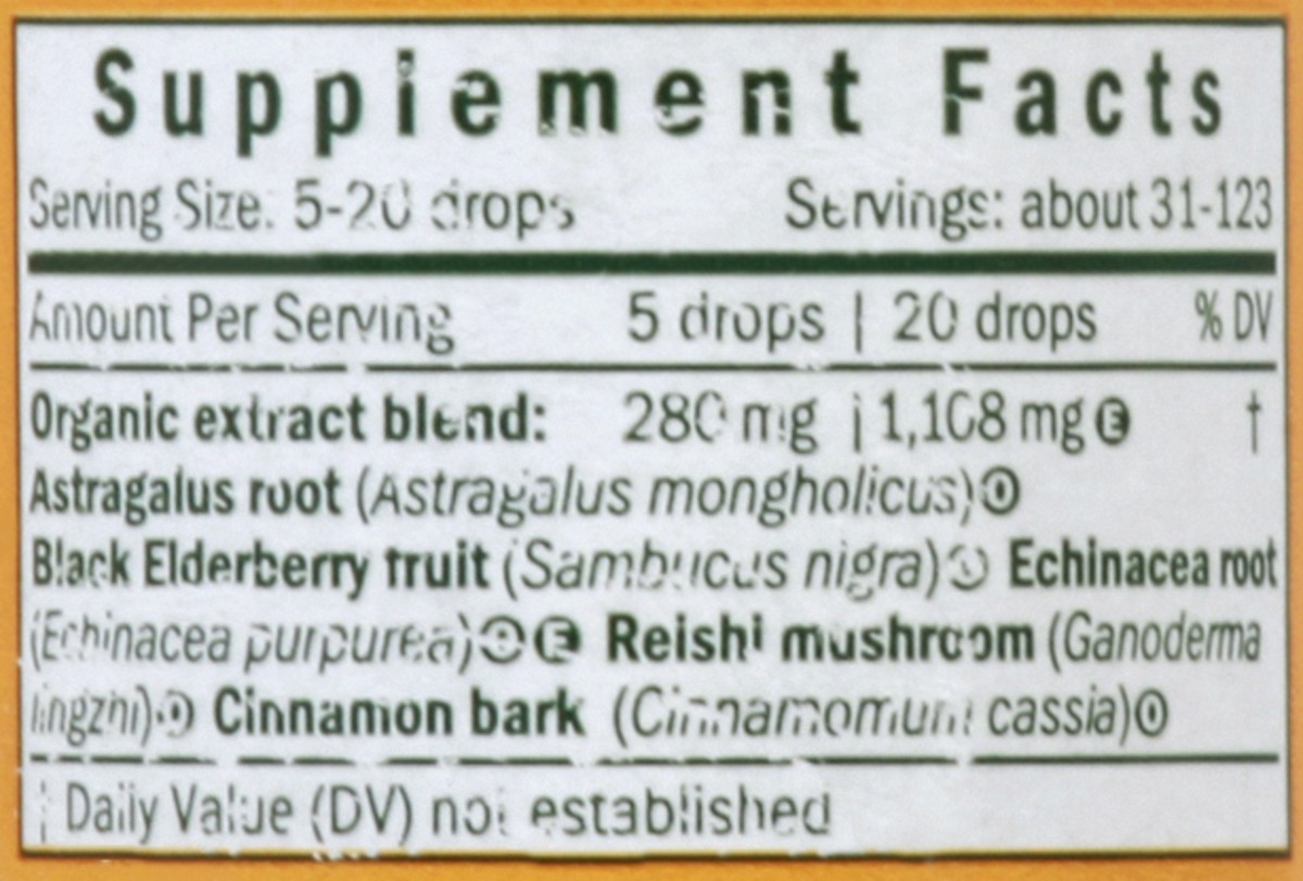 Organic Extract Blend (Extraction Rate 14-57 mg Fresh Herb and 40-161 mg Dry Herb per 5-20 Drops): Astragalus Root (Astragalus Mongholicus) (Certified Organic), Black Elderberry Fruit (Sambucus Nigra)…