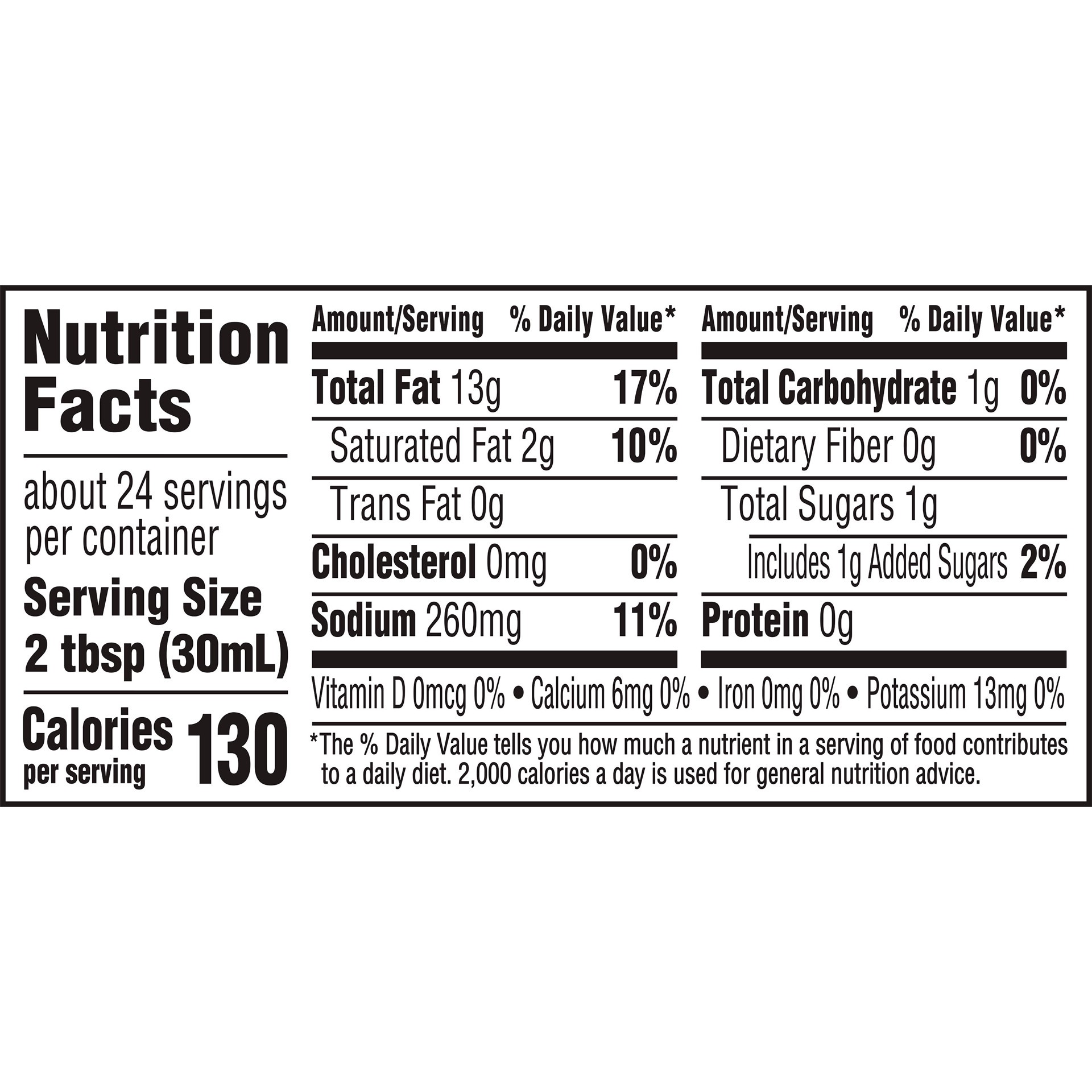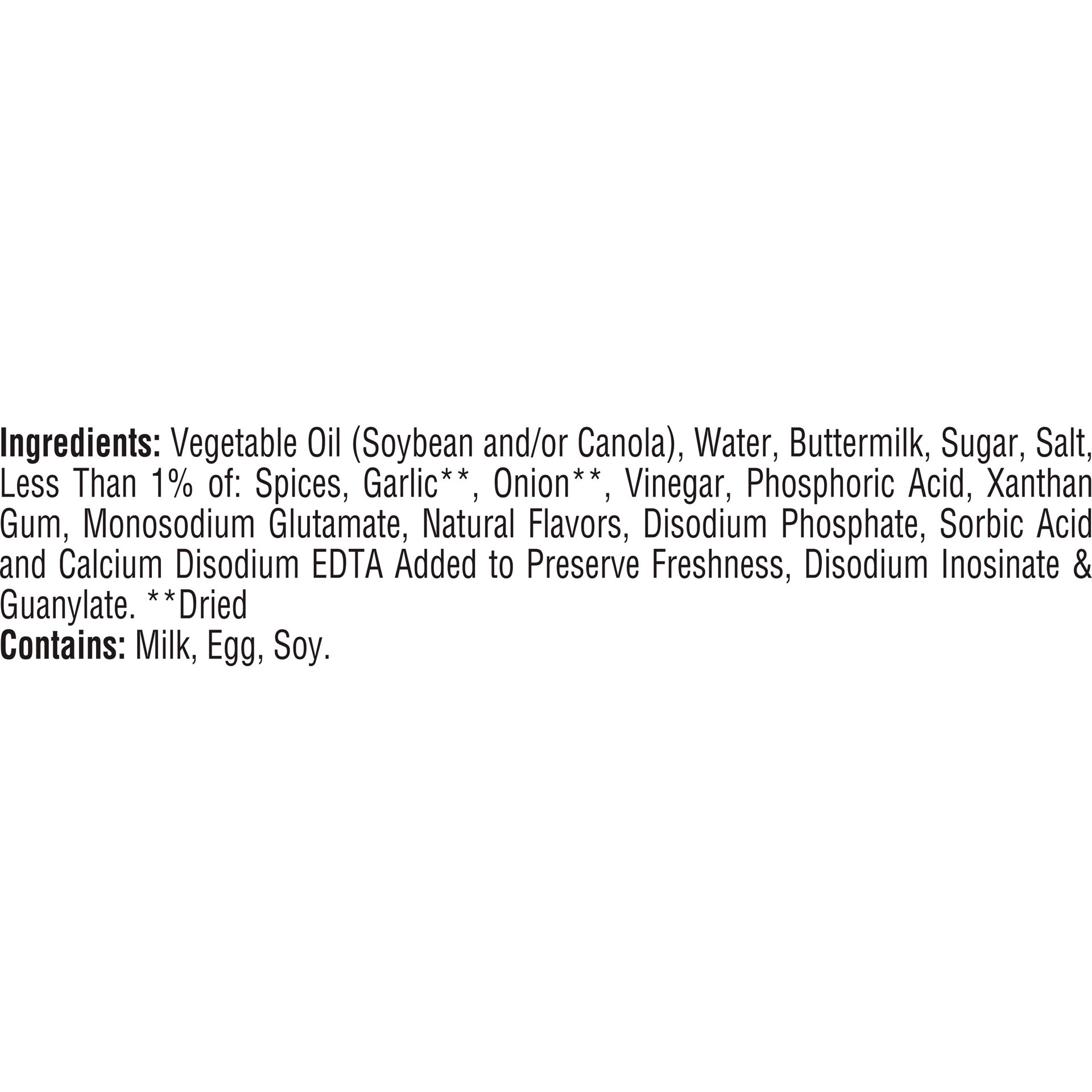 Vegetable Oil (Soybean and/or Canola), Water, Buttermilk, Sugar, Salt, Less than 1% of: Spices, Garlic**, Onion**, Vinegar, Phosphoric Acid, Xanthan Gum, Monosodium Glutamate, Natural Flavors, Disodiu…