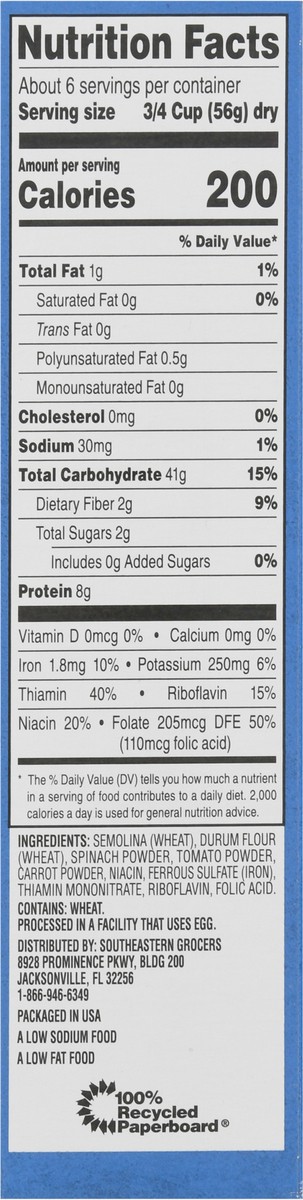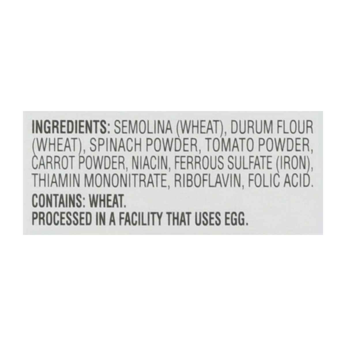 Semolina (Wheat), Durum Flour (Wheat), Spinach Powder, Tomato Powder, Carrot Powder, Niacin, Ferrous Sulfate (Iron), Thiamin Mononitrate, Riboflavin, Folic Acid.