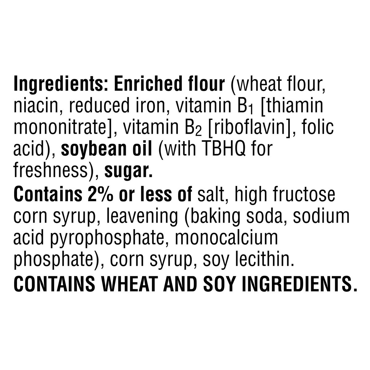 Enriched Flour (Wheat Flour, Niacin, Reduced Iron, Vitamin B1 [Thiamin Mononitrate], Vitamin B2 [Riboflavin], Folic Acid), Soybean Oil (with TBHQ for Freshness), Sugar. Contains 2% or Less of Salt, Hi…