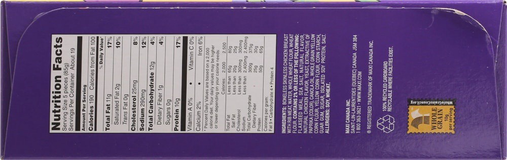 Boneless Skinless Chicken Breast with Rib Meat, Water, Whole Wheat Flour, Wheat Flour. Contains 2% or Less of the Following: Flaxseed Meal, Sea Salt, Natural Flavor, Natural Chicken Flavor, Yeast, Ext…