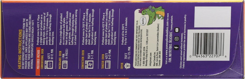 Breaded dinosaur-shaped chicken breast patties with rib meat. No artificial ingredients, flavors, colors and no preservatives. 700 mg Omega-3 fatty acids per serving from canola oil & flax. 10 g prote…
