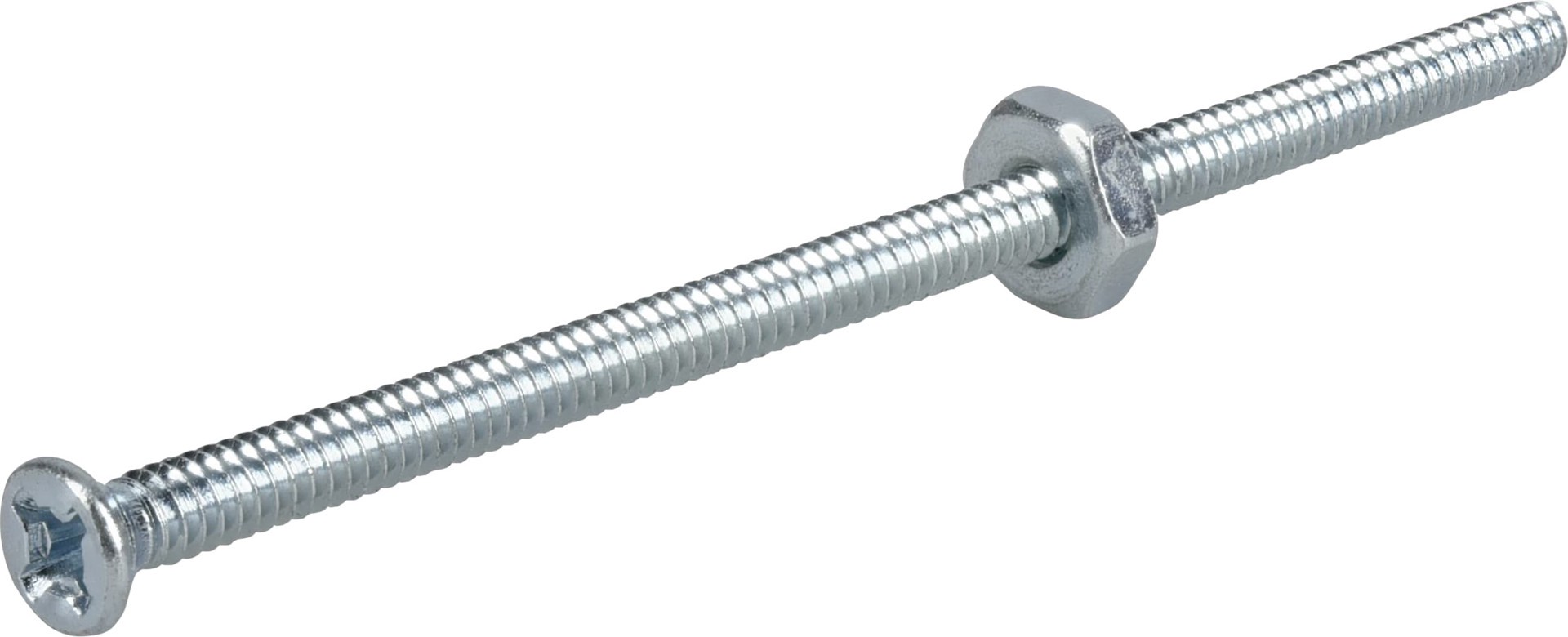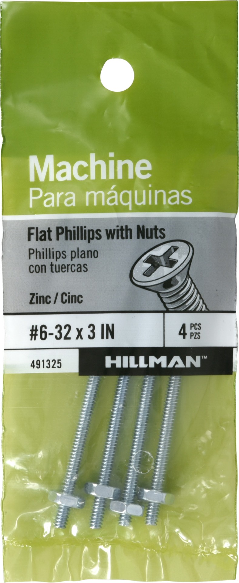 Common applications include machines, appliances, electronic devices, and vehicles. Flat-head Phillips machine screws with nuts. 4 pieces per retail package. Phillips drive.