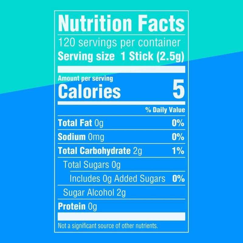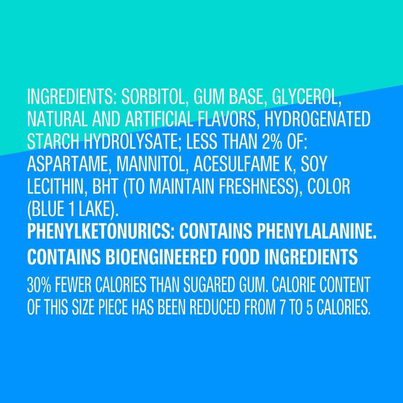Sorbitol, Gum Base, Glycerol, Natural and Artificial Flavors, Hydrogenated Starch Hydrolysate; Less than 2% of: Aspartame, Mannitol, Acesulfame K, Soy Lecithin, BHT (to Maintain Freshness), Color (Blu…