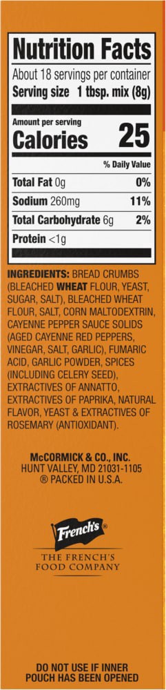 Bread Crumbs (Bleached Wheat Flour, Yeast, Sugar, Salt), Bleached Wheat Flour, Salt, Corn Maltodextrin, Cayenne Pepper Sauce Solids (Aged Cayenne Red Peppers, Vinegar, Salt, Garlic), Fumaric Acid, Gar…