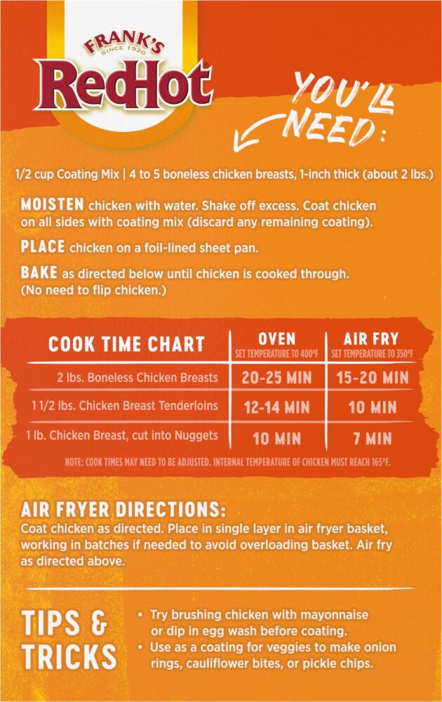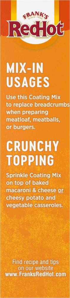 Shake up everyday meals with Frank's RedHot Seasoned Coating Mix Buffalo. Made with ingredients including breadcrumbs, aged cayenne red peppers, and garlic powder, this seasoned coating mix kicks thin…