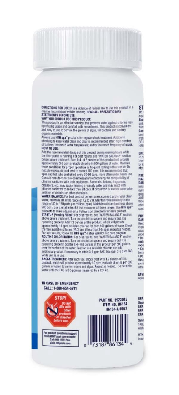 About This Item Get clear, comfortable water with this convenient and easytouse sanitizer. HTH Spa Clear Chlorinating Sanitizer controls algae, kills bacteria and destroys contaminants. For best resul…