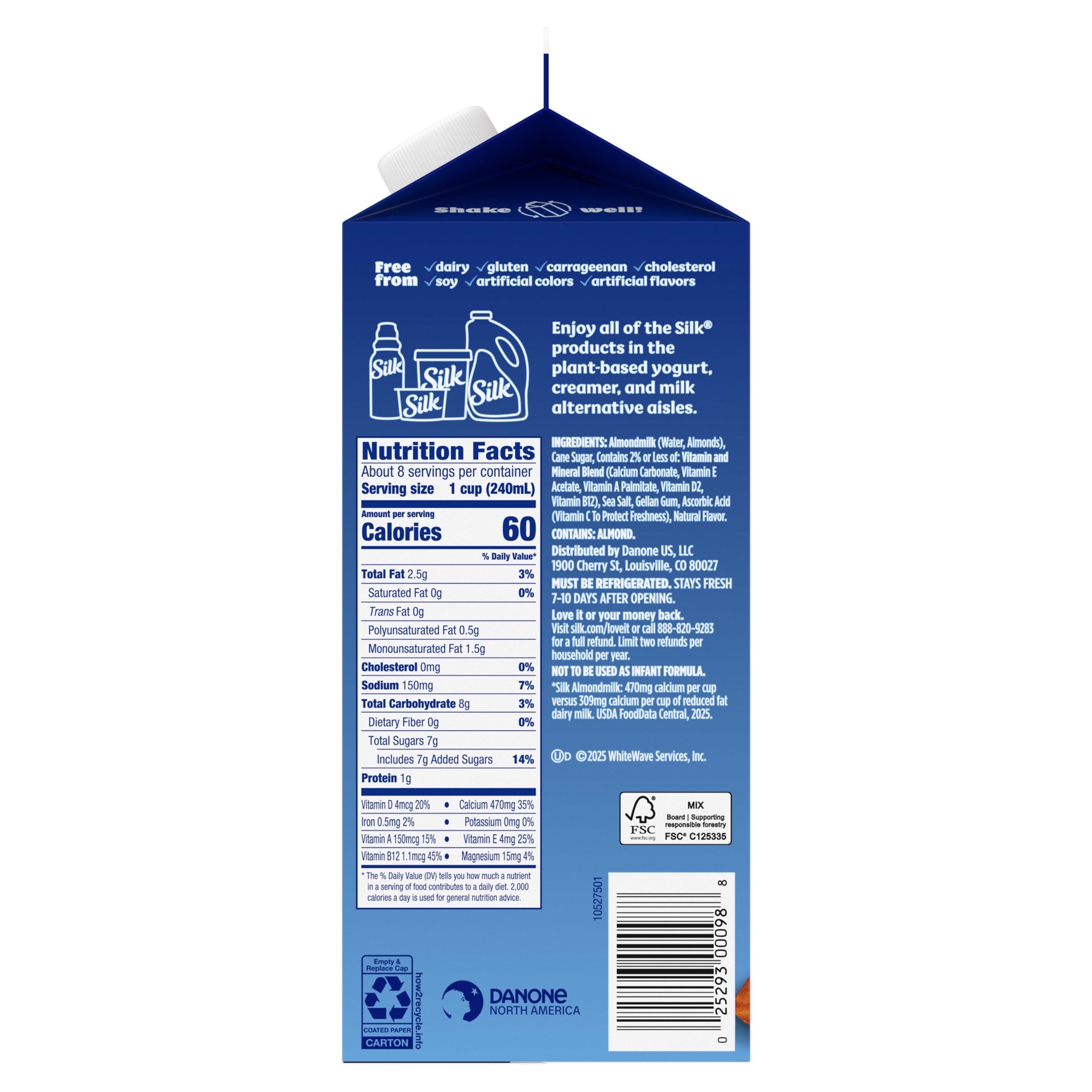 ALMONDMILK (WATER, ALMONDS), CANE SUGAR, CONTAINS 2% OR LESS OF: VITAMIN AND MINERAL BLEND (CALCIUM CARBONATE, VITAMIN E ACETATE, VITAMIN A PALMITATE, VITAMIN D2, VITAMIN B12), SEA SALT, GELLAN GUM, A…