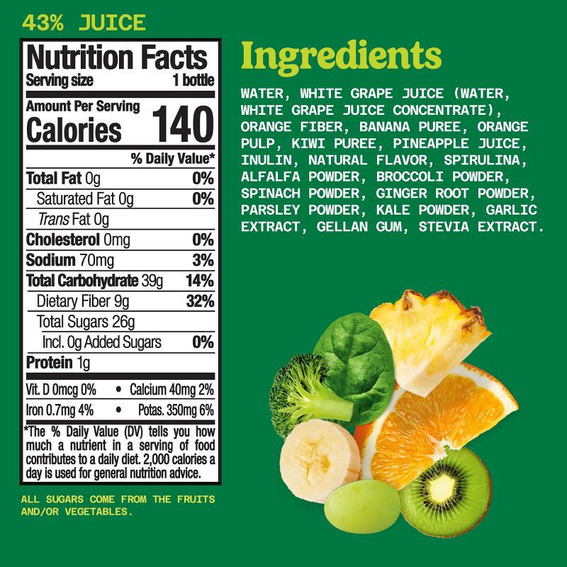 ingredients: water, white grape juice (water, white grape juice concentrate), orange fiber, banana puree, orange pulp, kiwi puree, pineapple juice, inulin, natural flavor, spirulina, alfalfa powder, b…