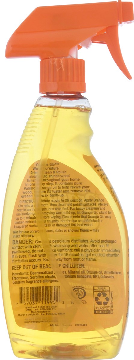 No wax, water or alcohol. Orange Glo Wood Furniture 2-In-1 clean & Polish cleans and shines wood finishes throughout your home in one easy step. It contains pure Valencia orange oil to help revive you…