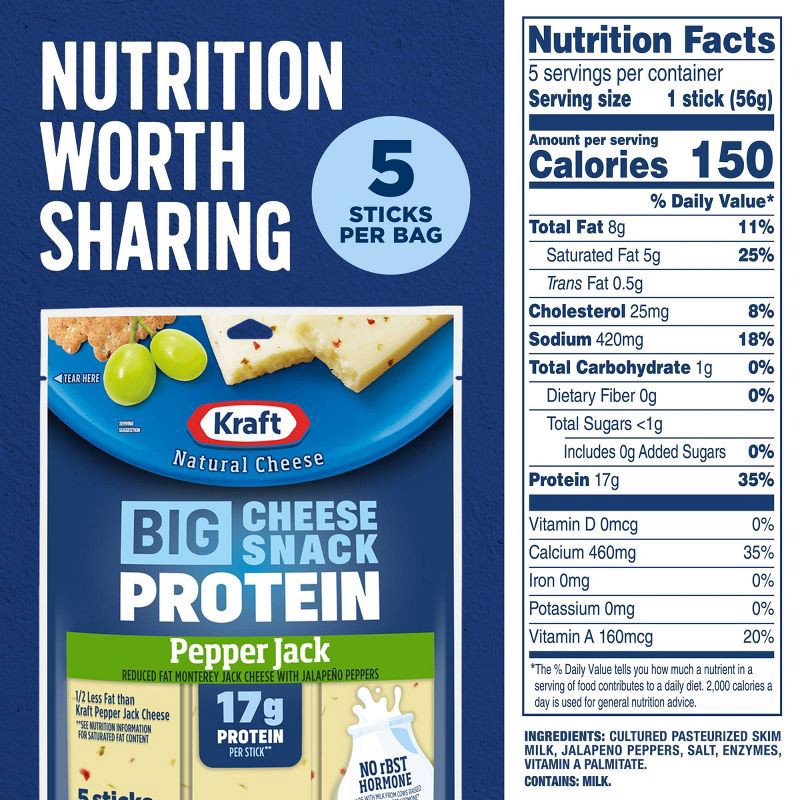 - 17g of protein per stick and 50% less fat than regular Kraft Pepper Jack Cheese