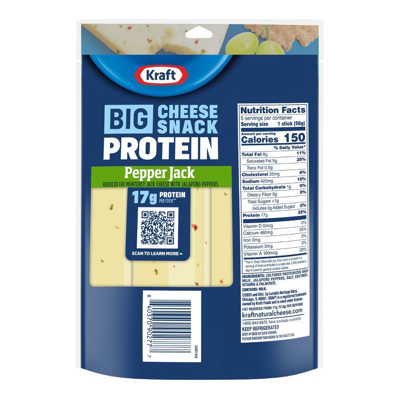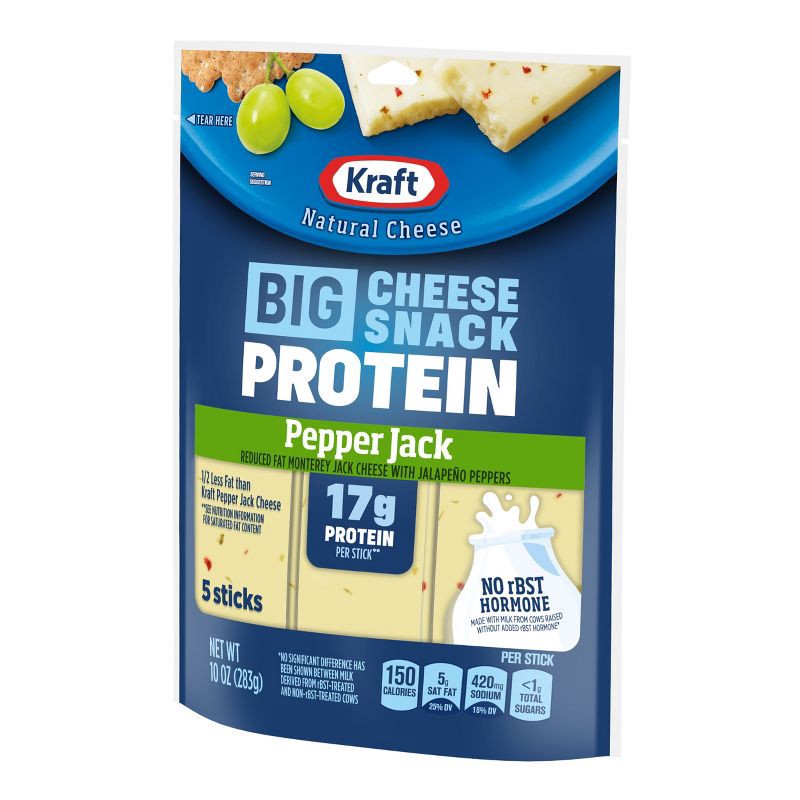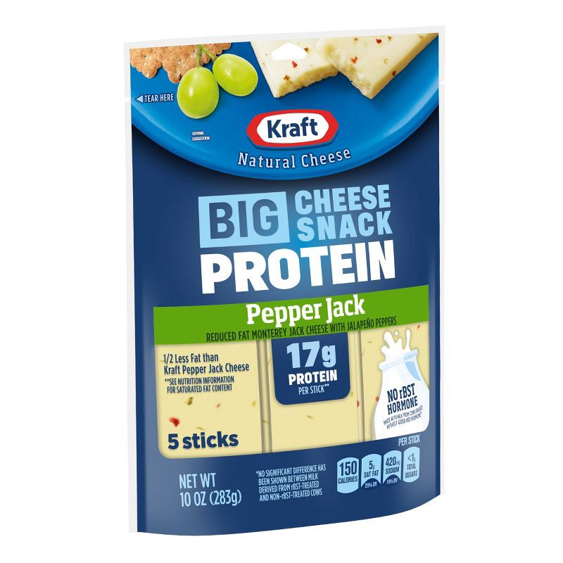 - One 10 oz bag Kraft Reduced Fat Protein Pepper Jack Big Sticks, 5 individually wrapped BIG Cheese sticks