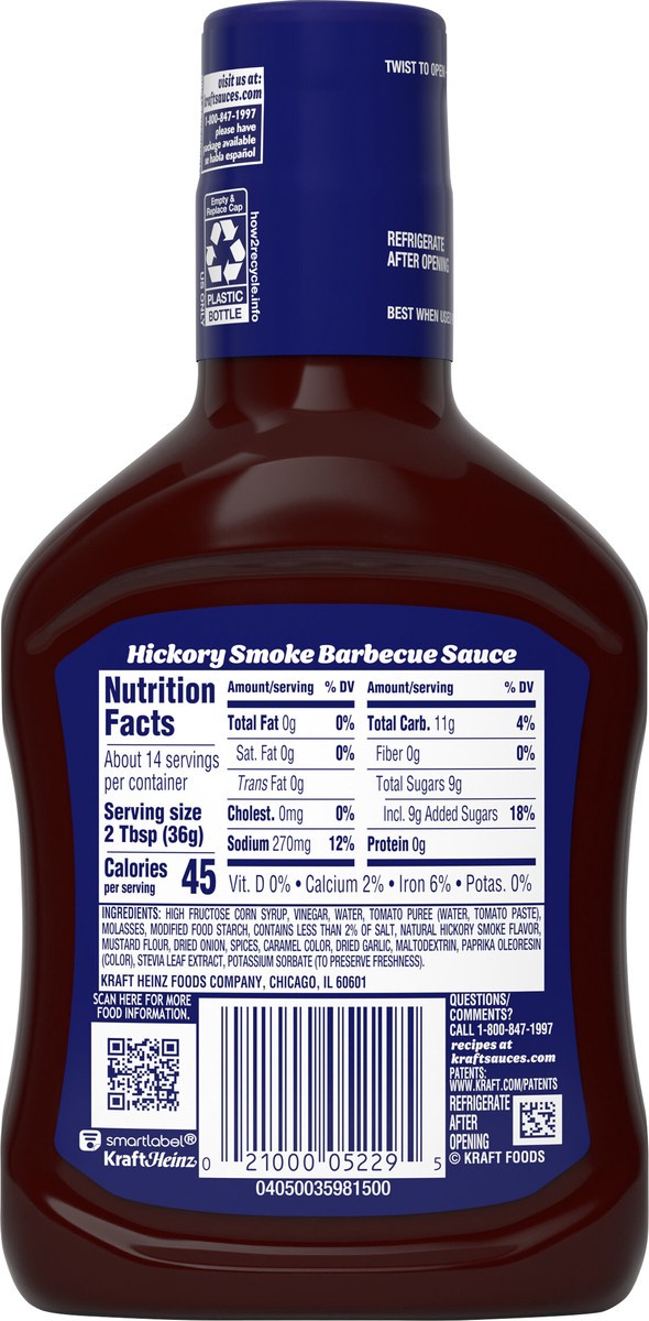 Kraft Hickory Smoke Slow-Simmered Barbecue Sauce and Dip adds bold, smoky barbecue flavor to almost anything. Bursting with molasses, vinegar, spices and smoky hickory flavor, our tangy BBQ sauce deli…