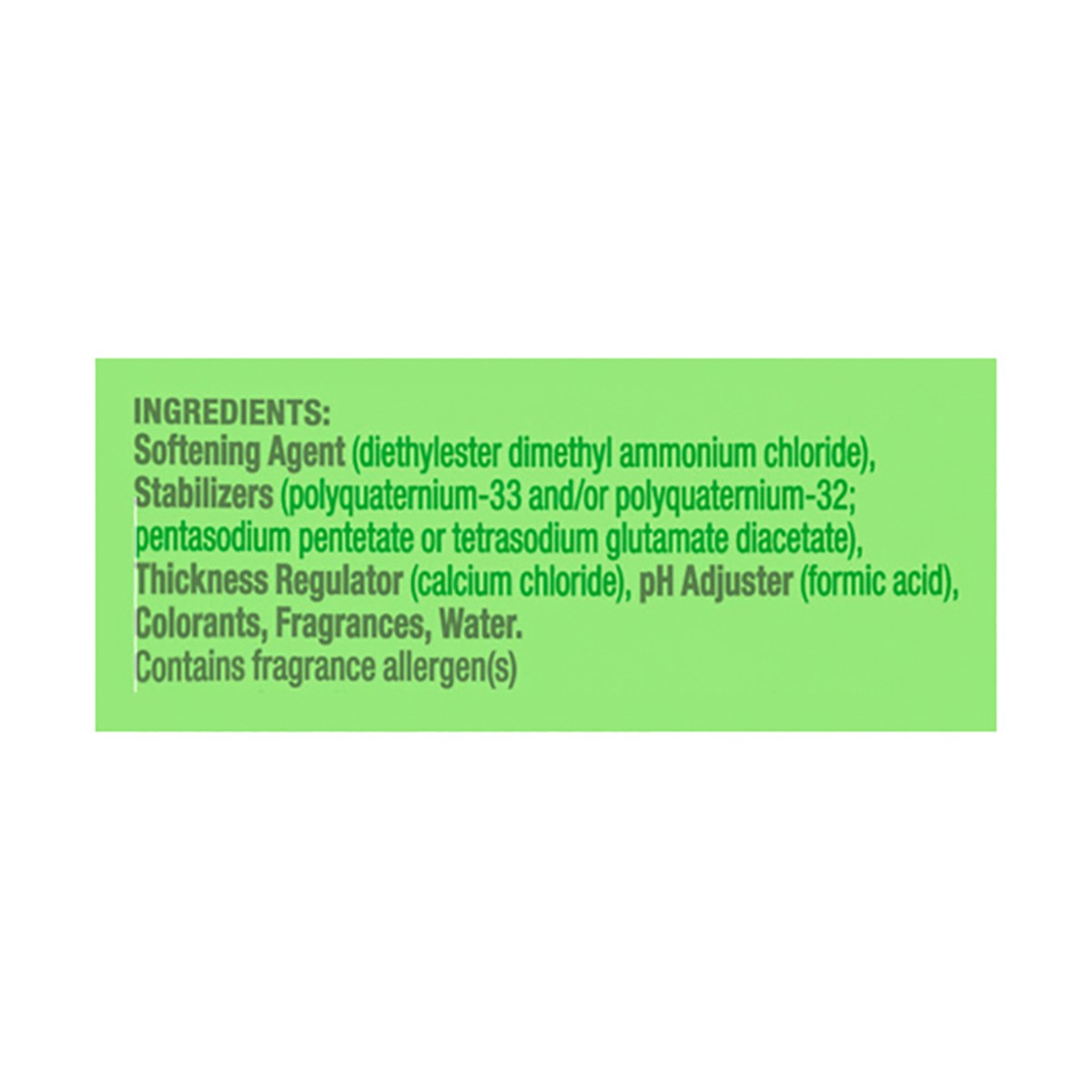 Softening Agent (Diethylester Dimethyl Ammonium Chloride), Stabilizers (Polyquaternium-32; Polyquaternium-33; Pentasodium Pentetate), Thickness Regulator (Calcium Chloride), pH Adjuster (Formic Acid),…