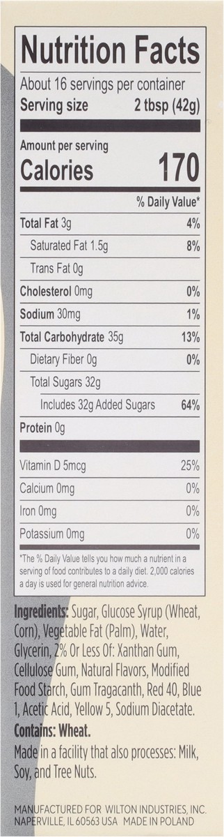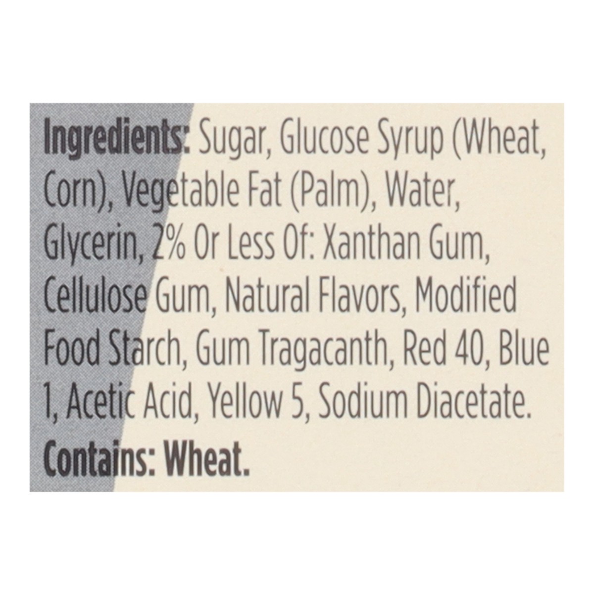 Sugar\, Glucose Syrup (Wheat\, Corn)\, Vegetable Fat (Palm)\, Water\, Glycerin\, 2% or Less of: Xanthan Gum\, Cellulose Gum\, Natural Flavors\, Modified Food Starch\, Gum Tragacanth\, Red 40\, Blue 1\…