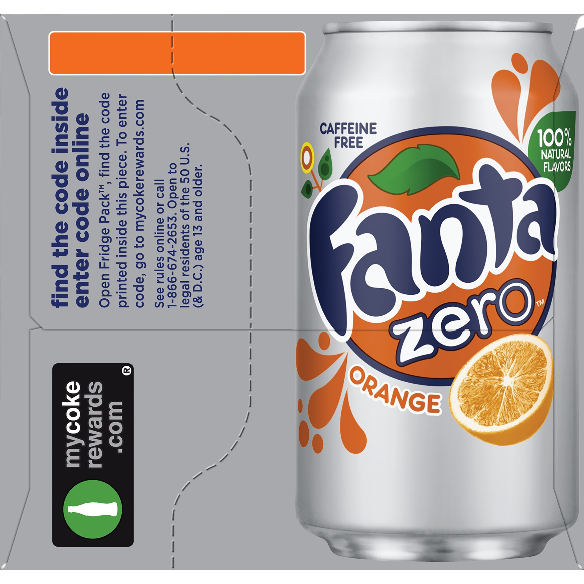 - 12 fl oz cans of Fanta Zero Sugar Orange Soda soft drinks in a fridge pack for lip-smacking deliciousness in every vibrant sip