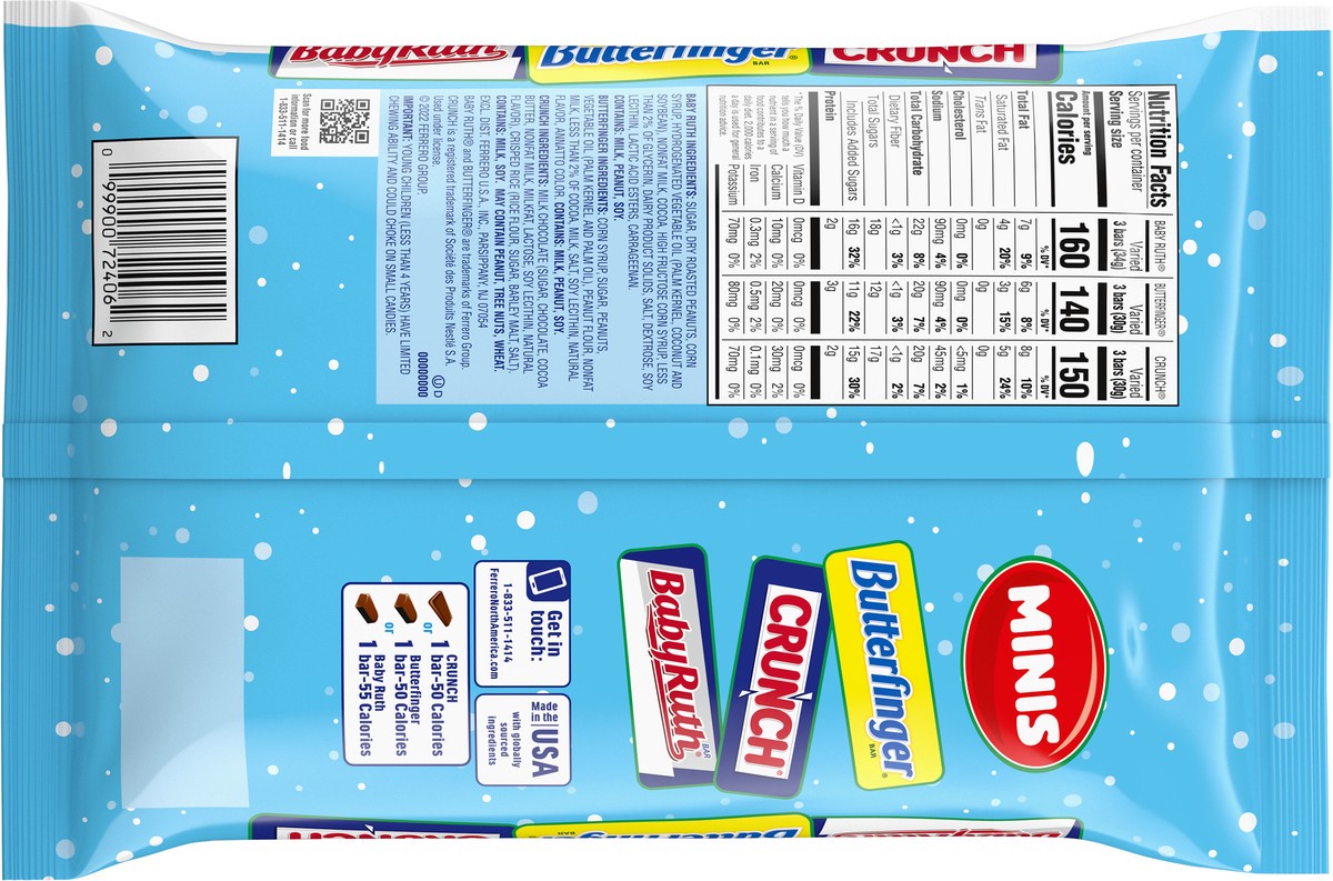 Crunch: Milk Chocolate (Sugar, Chocolate, Cocoa Butter, Nonfat Milk, Milkfat, Lactose, Soy Lecithin, Natural Flavor), Crisped Rice (Rice Flour, Sugar, Barley Malt, Salt). Baby Ruth: Sugar, Dry Roasted…