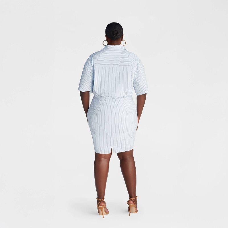 A sleek silhouette crafted from a menswear-inspired poplin, this dress features a blouson top and a shirred bottom that fits snugly around the hips. Complete with a button-down front and a small back …
