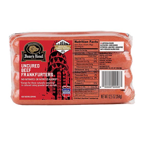 Crafted from an original family recipe, Boar's Head Uncured Beef Frankfurters are made with USDA Choice Beef and select seasonings for an exceptional flavor and a superior bite.