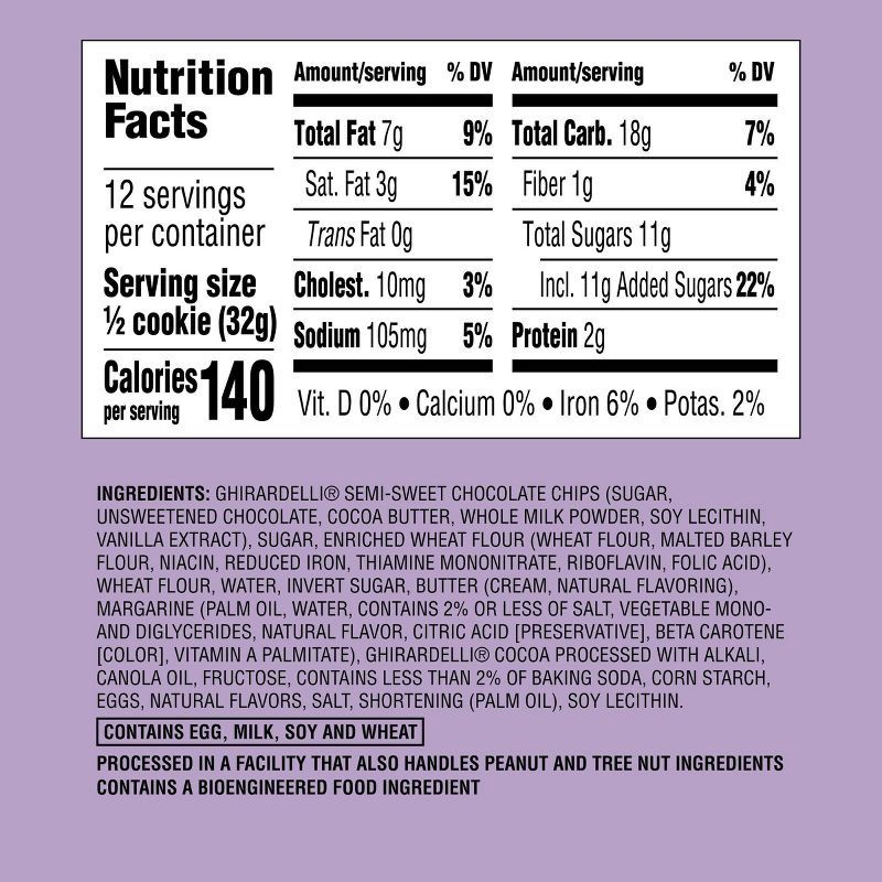 GHIRARDELLI SEMI-SWEET CHOCOLATE CHIPS (SUGAR, UNSWEETENED CHOCOLATE, COCOA BUTTER, WHOLE MILK POWDER, SOY LECITHIN, VANILLA EXTRACT), SUGAR, ENRICHED WHEAT FLOUR (WHEAT FLOUR, MALTED BARLEY FLOUR, NI…