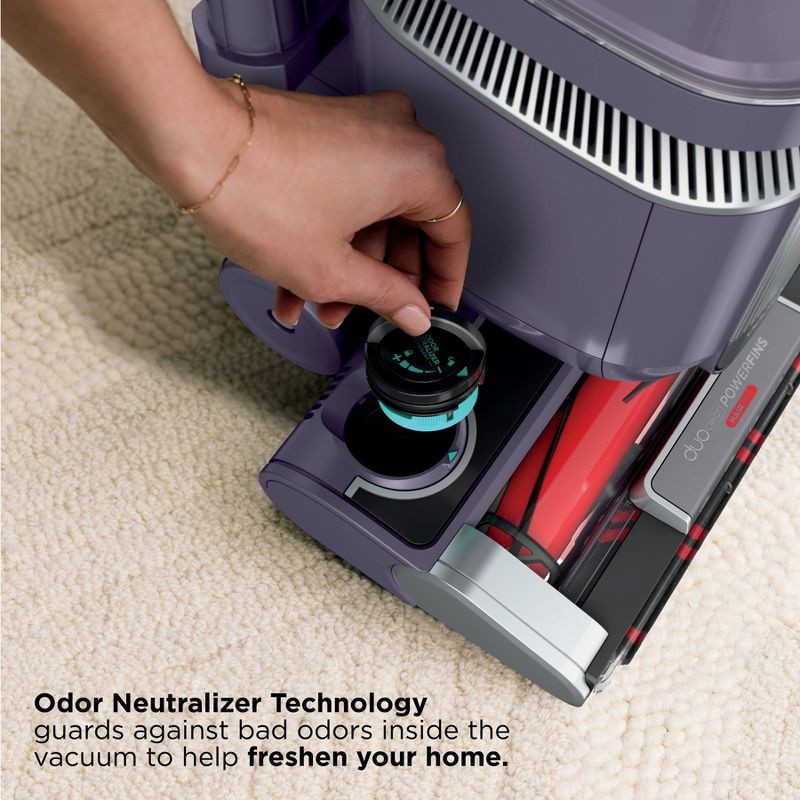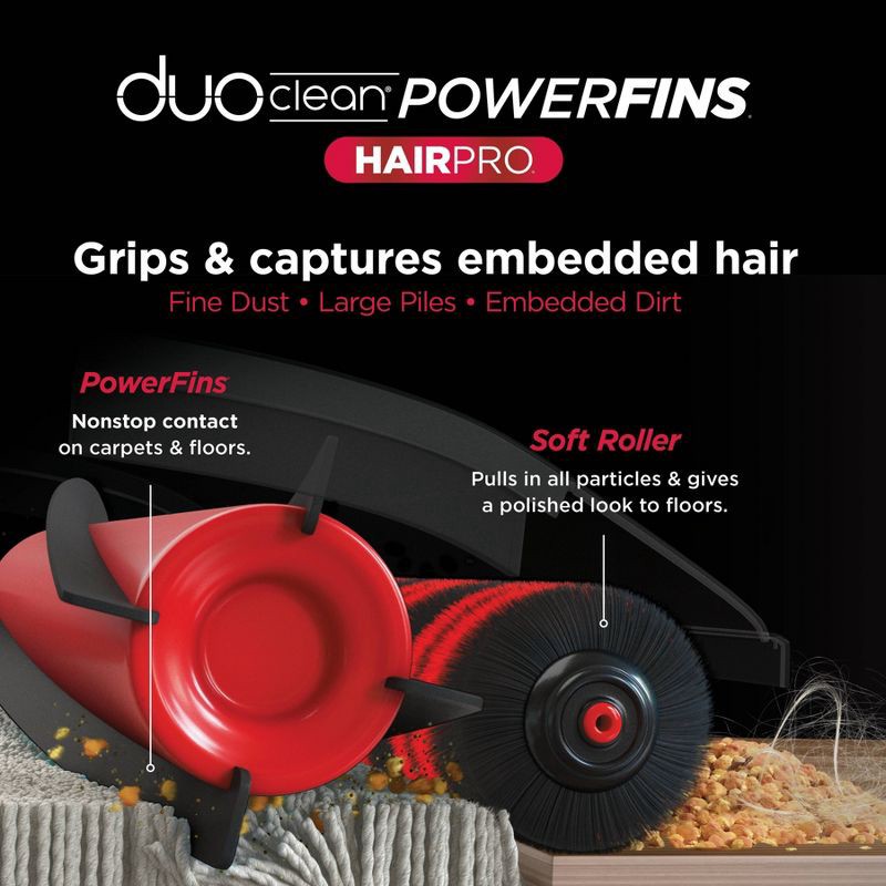 - DUOCLEAN® POWERFINS® HAIRPRO®: The two-brushroll system digs deep into carpets, directly engages hard floors, and picks up dirt, debris, and hair in every pass.