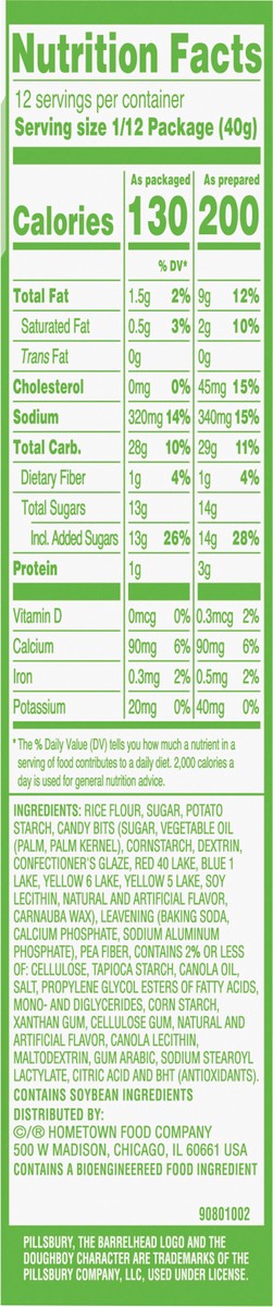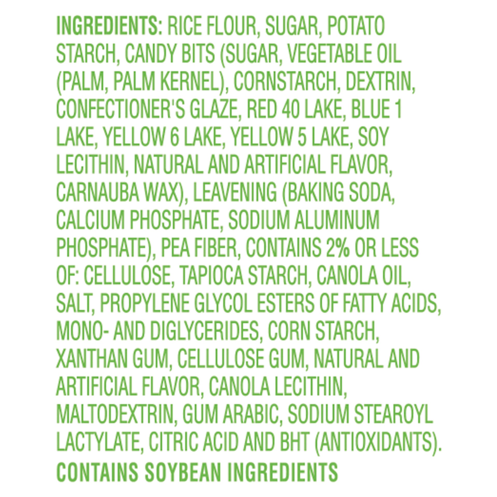 RICE FLOUR, SUGAR, POTATO STARCH, CANDY BITS (SUGAR, VEGETABLE OIL (PALM, PALM KERNEL), CORNSTARCH, DEXTRIN, CONFECTIONER''S GLAZE, RED 40 LAKE, BLUE 1 LAKE, YELLOW 6 LAKE, YELLOW 5 LAKE, SOY LECITHIN…
