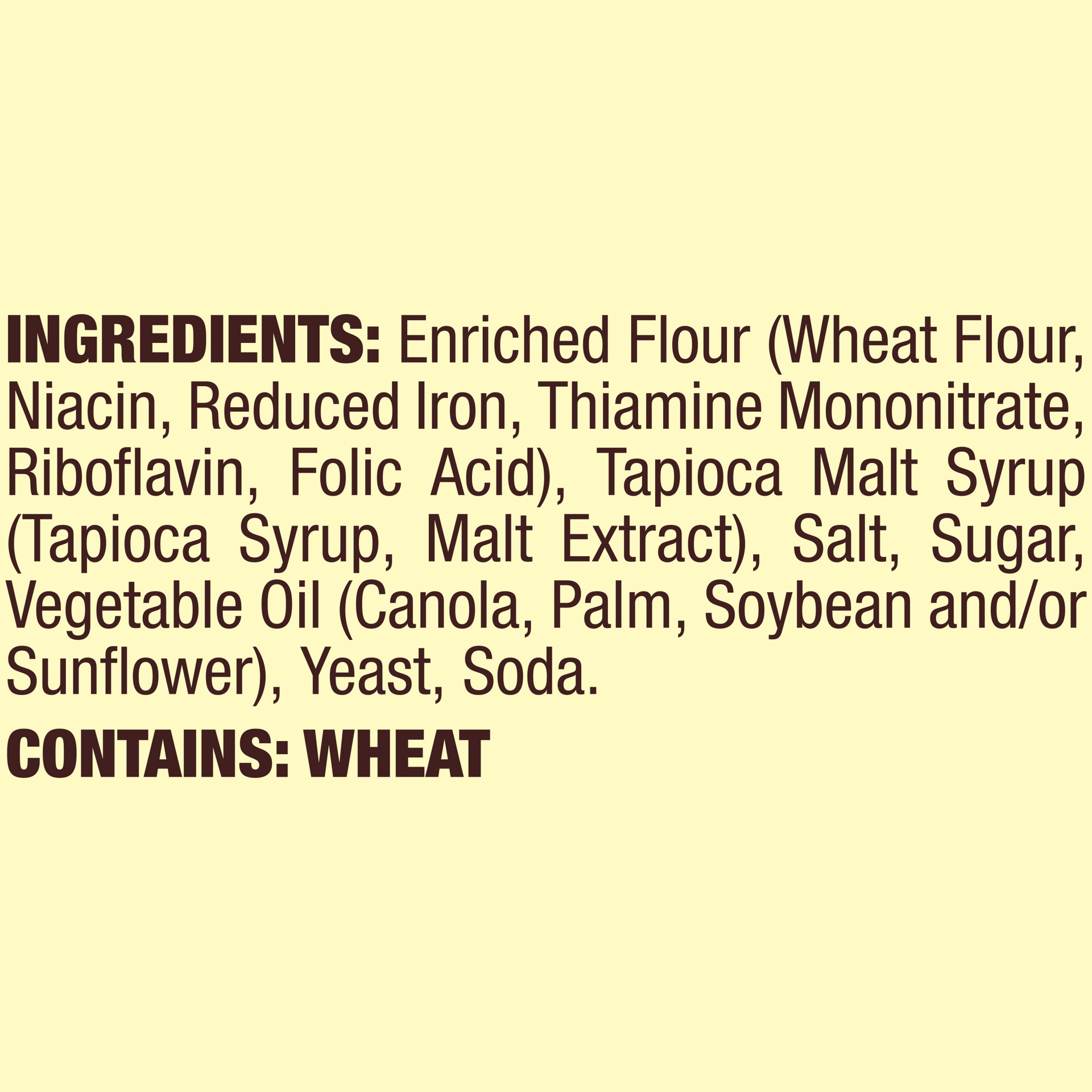INGREDIENTS: ENRICHED FLOUR (WHEAT FLOUR, NIACIN, REDUCED IRON, THIAMINE MONONITRATE, RIBOFLAVIN, FOLIC ACID), TAPIOCA MALT SYRUP (TAPIOCA SYRUP, MALT EXTRACT), SALT, SUGAR, VEGETABLE OIL (CANOLA, PAL…