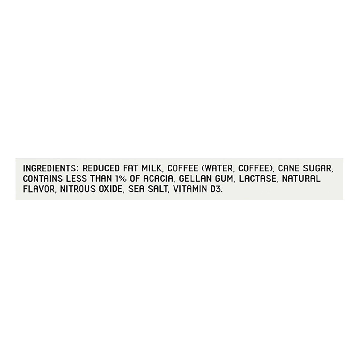 Reduced Fat Milk, Coffee (Water, Coffee), Cane Sugar, Contains Less than 1% of Acacia, Gellan Gum, Lactase, Natural Flavor, Nitrous Oxide, Sea Salt, Vitamin D3.