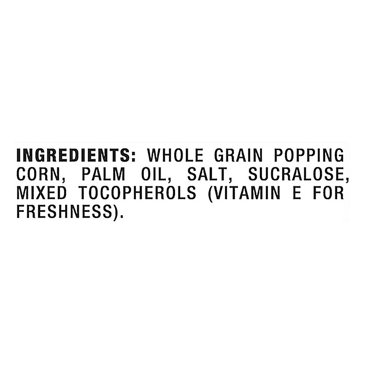 Whole Grain Popping Corn, Palm Oil, Salt, Sucralose, Mixed Tocopherols (Vitamin E for freshness).