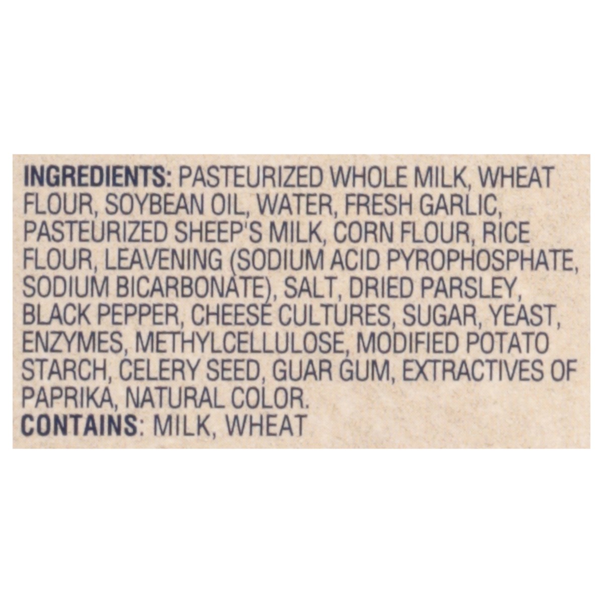 Pasteurized Whole Milk, Wheat Flour, Soybean Oil, Water, Fresh Garlic, Pasteurized Sheep's Milk, Corn Flour, Rice Flour, Leavening (Sodium Acid Pyrophosphate, Sodium Bicarbonate), Salt, Dried Parsley,…
