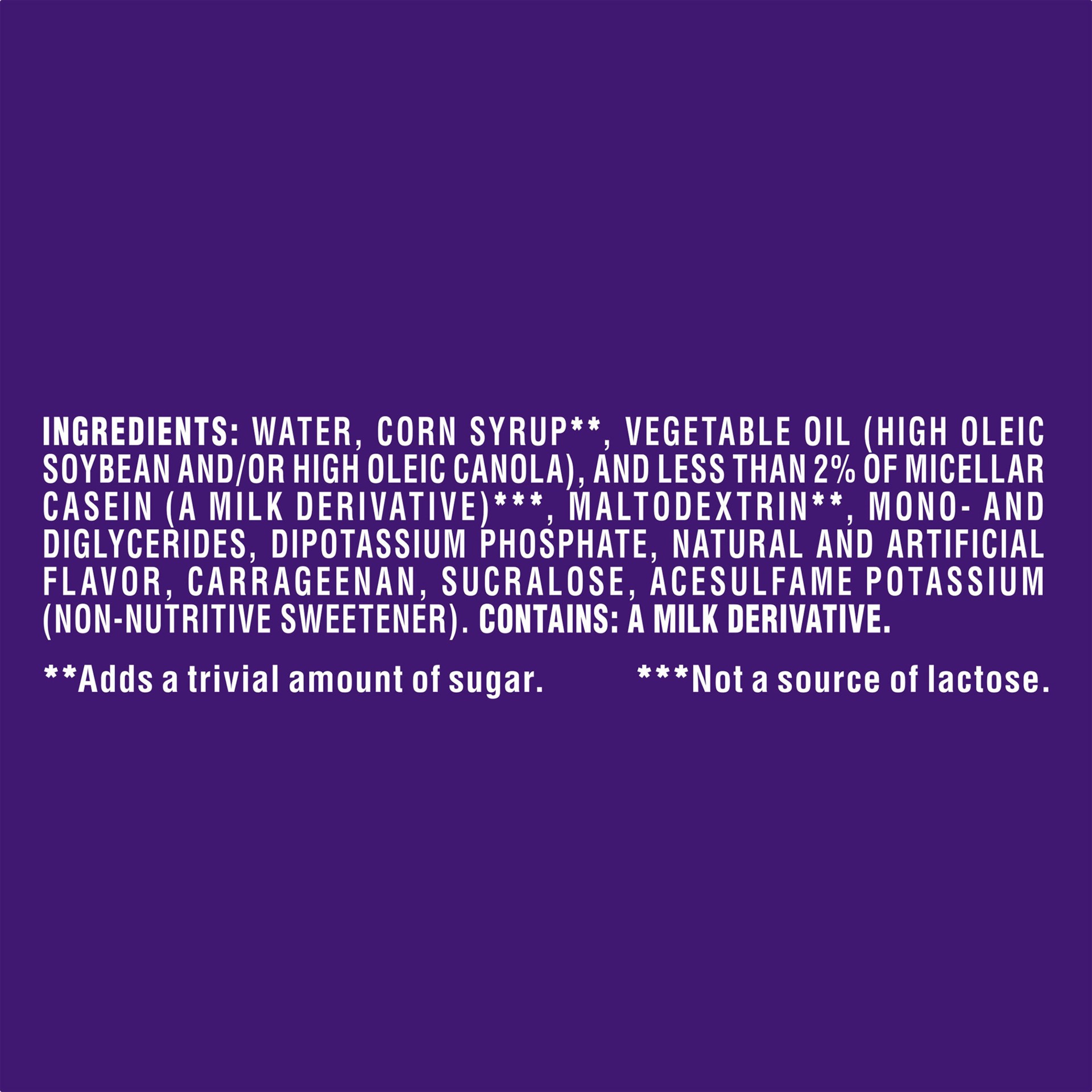 INGREDIENTS: WATER, CORN SYRUP, VEGETABLE OIL (HIGH OLEIC SOYBEAN AND/OR HIGH OLEIC CANOLA), AND LESS THAN 2% OF MICELLAR CASEIN (A MILK DERIVATIVE), MALTODEXTRIN, MONO- AND DIGLYCERIDES, DIPOTASSIUM …