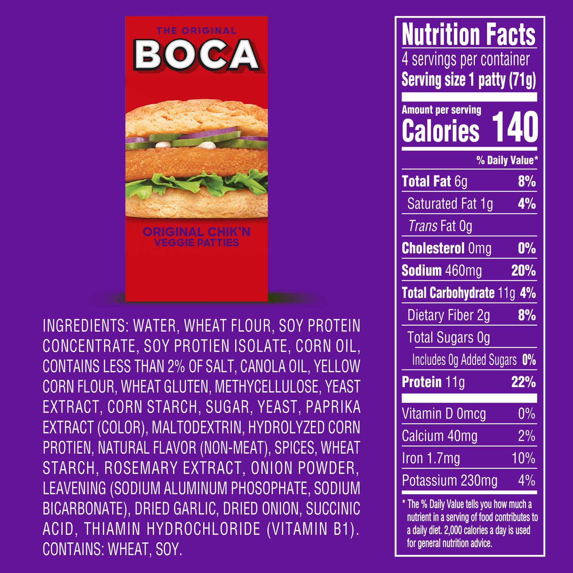 BOCA Original Chik'n Vegan Patties offer an easy-to-make meat substitute that's perfect for creating sandwiches or topping salads. Our plant-based patties have a savory chicken flavor and contain 140 …