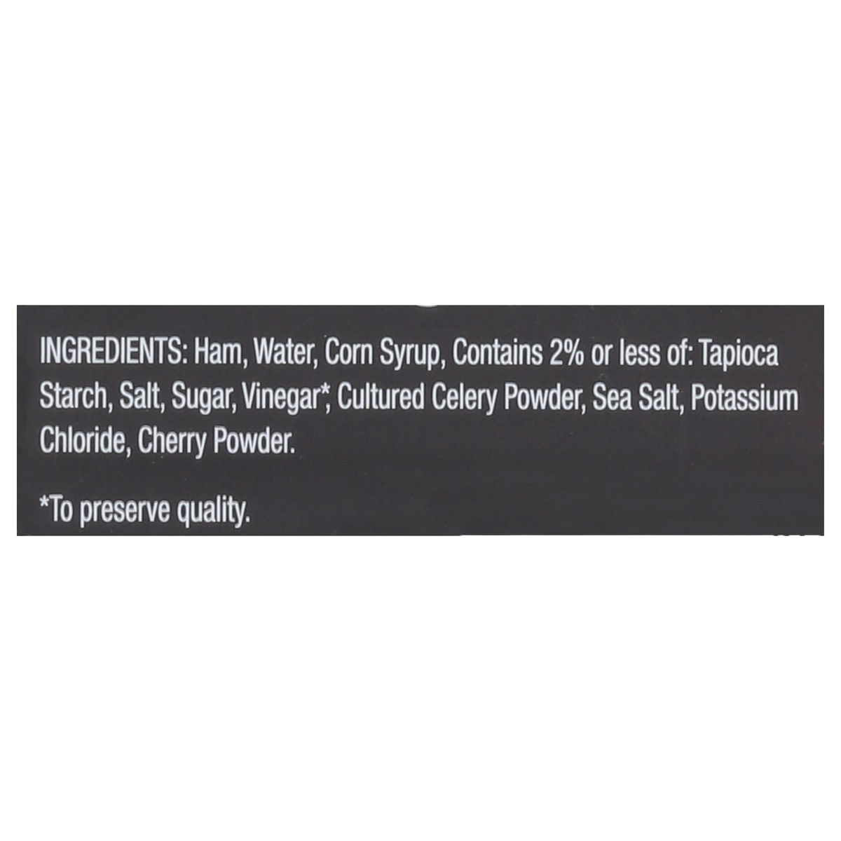 Ham, Water, Corn Syrup, Contains 2% or Less of: Tapioca Starch, Salt, Sugar, Vinegar (to Preserve Quality,), Cultured Celery Powder, Sea Salt, Potassium Chloride, Cherry Powder.