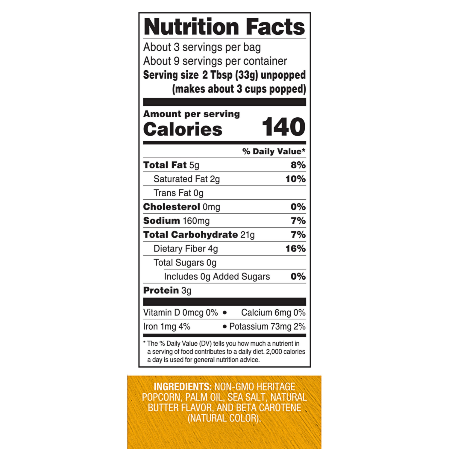 Non-GMO Popcorn, Palm Oil, Sea Salt, Natural Butter Flavor, and Beta Carotene (Natural Color).
