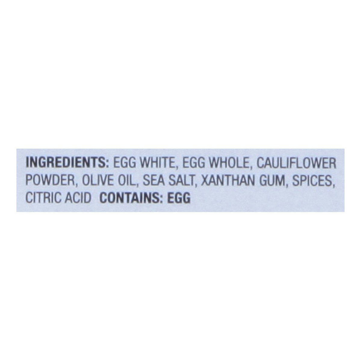 Egg White, Egg Whole, Cauliflower Powder, Olive Oil, Sea Salt, Xanthan Gum, Spices, Citric Acid.