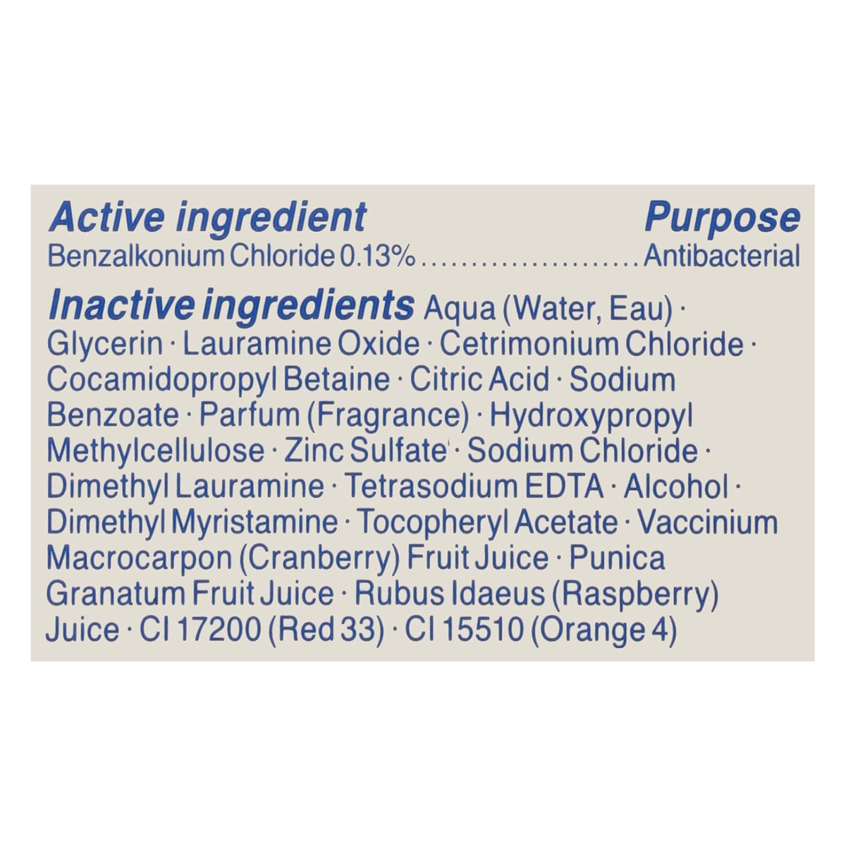 Active Ingredients: Benzalkonium Chloride (0.13 %), Antibacterial. Inactive Ingredients: Aqua (Water, Eau), Glycerin, Lauramine Oxide, Cetrimonium Chloride, Cocamidopropyl Betaine, Citric Acid, Sodium…