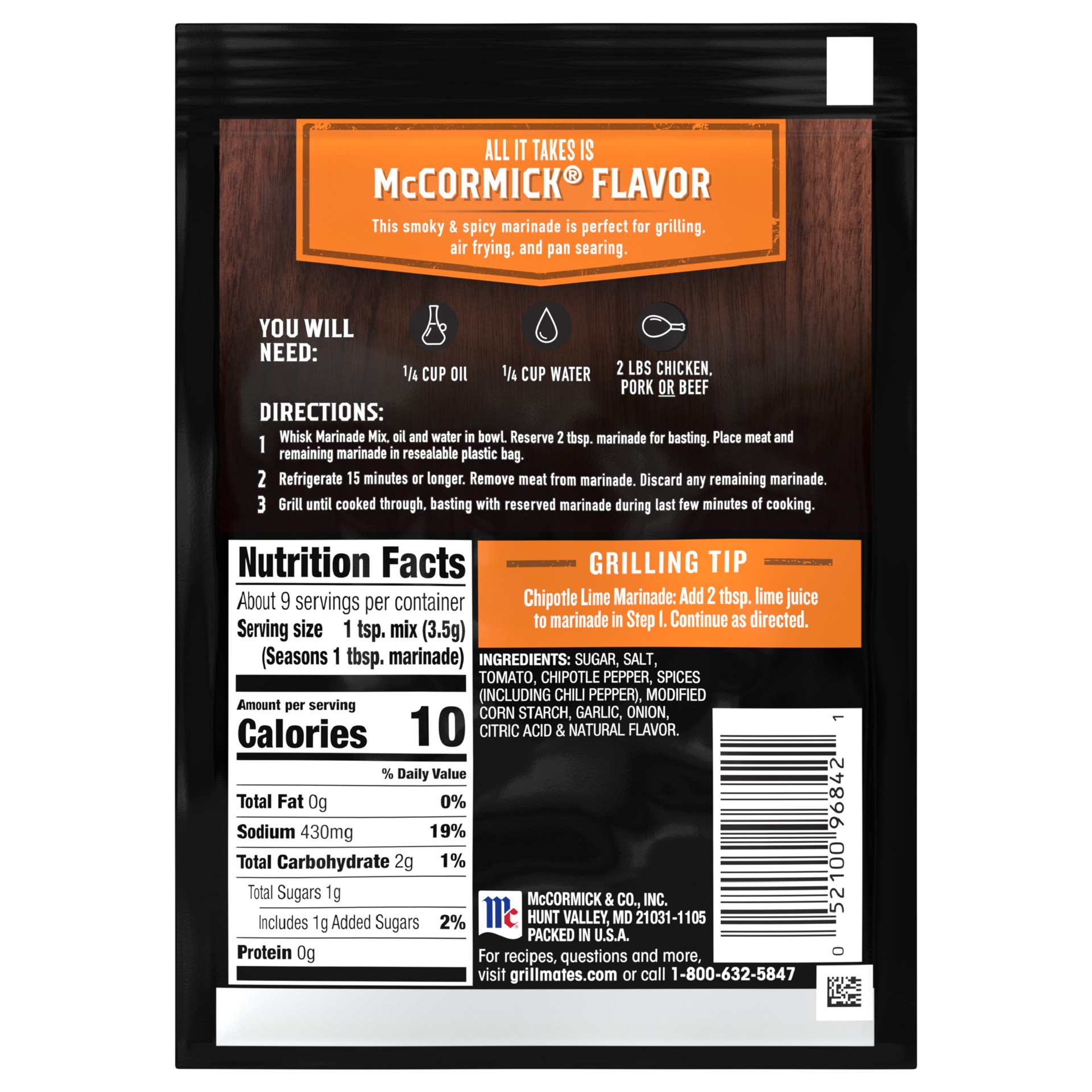 From America's #1 herb and spice brand, McCormick Grill Mates Chipotle Pepper Marinade Seasoning Mix is a smoky, spicy blend of chipotle pepper, tomato, garlic and onion. Enjoy the flavor of Grill Mat…