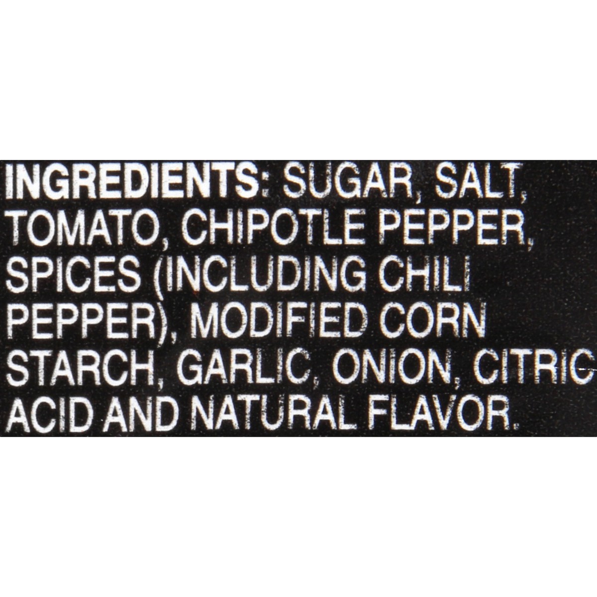 Sugar, Salt, Tomato, Chipotle Pepper, Spices (Including Chili Pepper), Modified Corn Starch, Garlic, Onion, Citric Acid and Natural Flavor.