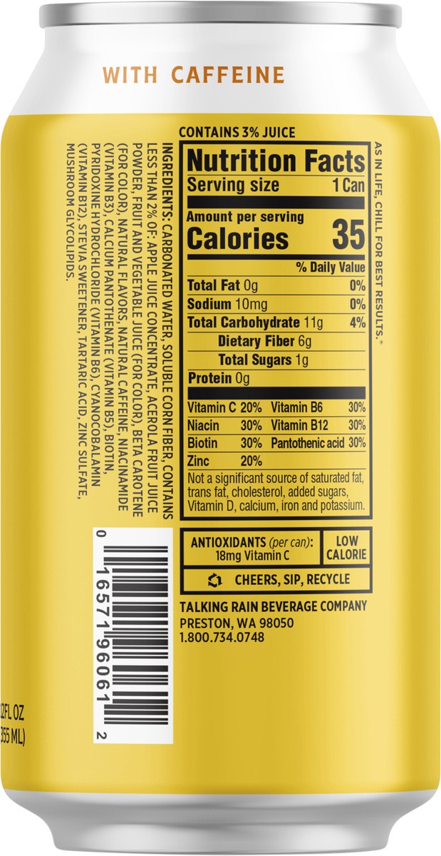 With caffeine. only 1 g sugar, 40 mg caffeine. Antioxidants (per can): 18 mg vitamin C. Low calorie. Full of Benefits: Excellent source: plant fiber, vitamin B, zinc, & antioxidants. Supports happy be…