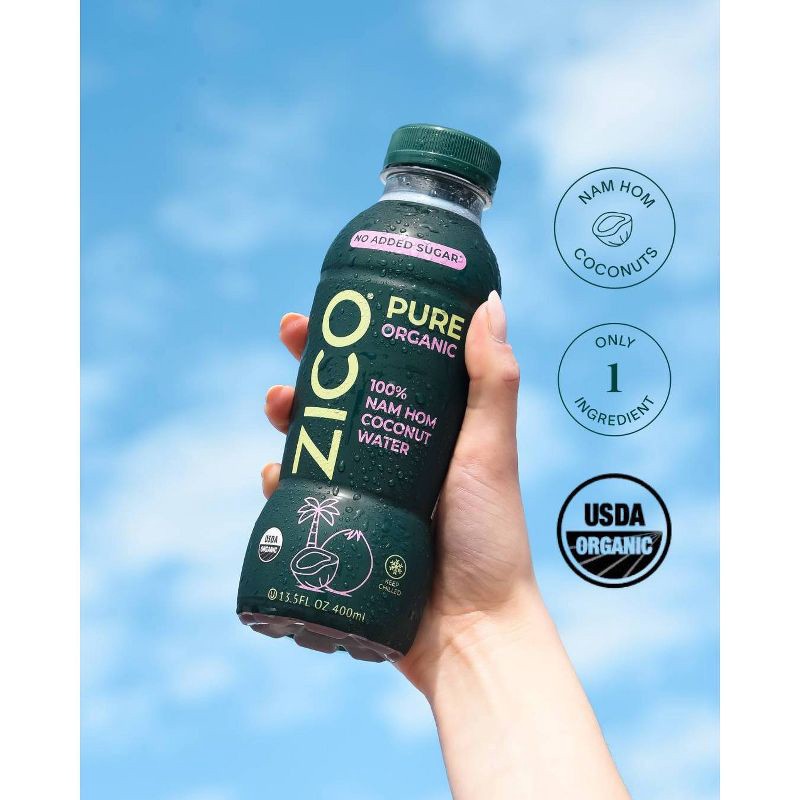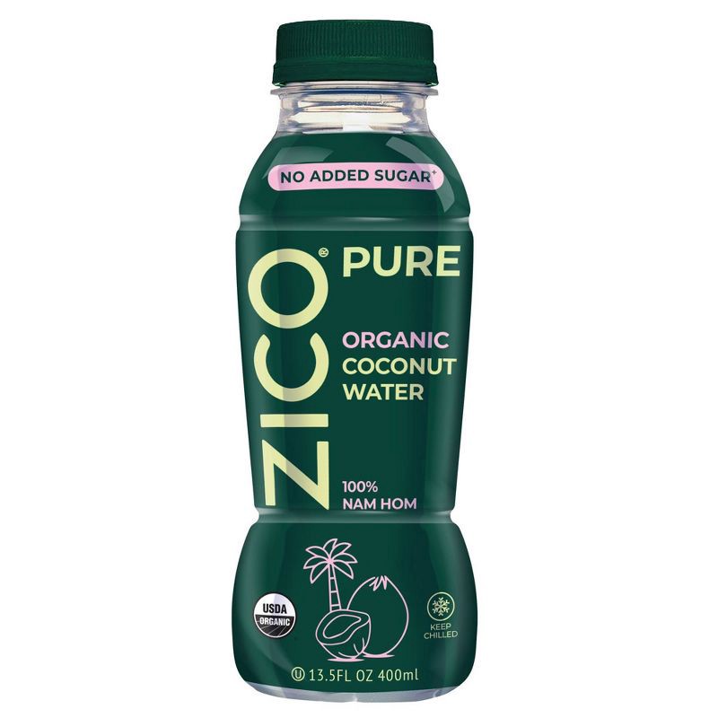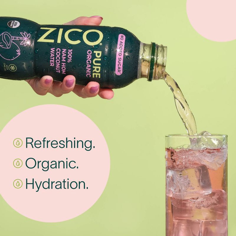 ZICO PURE Organic Coconut Water uses a single ingredient, the Nam Hom coconut from Thailand, offering naturally sweet hydration with a refreshing pink hue.