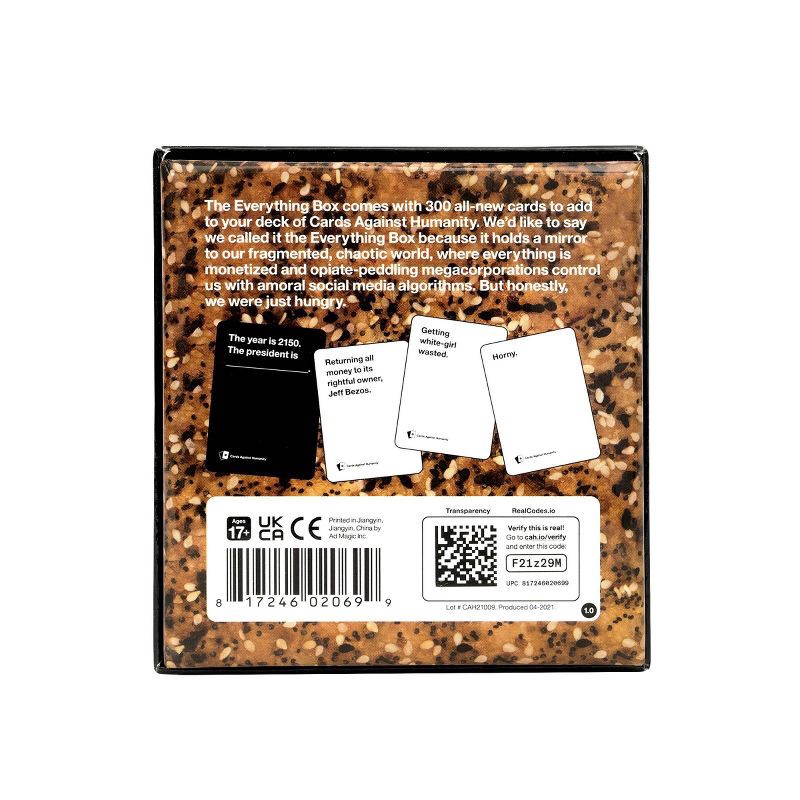 The Everything Box comes with 300 all-new cards to add to your deck of Cards Against Humanity.We'd like to say we called it the Everything Box because it holds a mirror to our fragmented, chaotic worl…