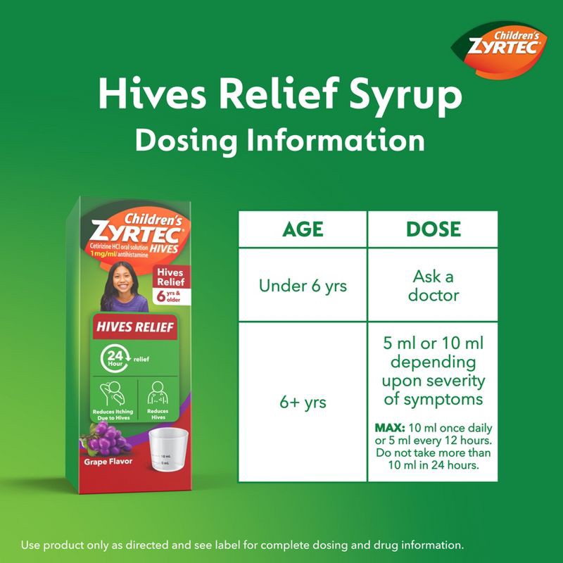- Pack Children's Zyrtec Hives Relief to relieve hives and hives related itching on the go
