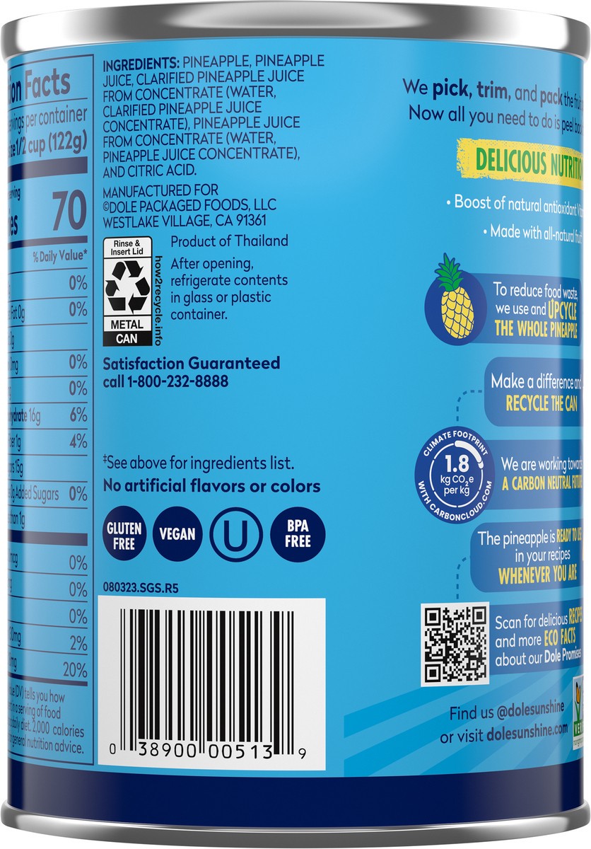 DOLE Pineapple Tidbits in 100% Juice are rich in Vitamin C, have no added sugar, and are made from all natural fruit and non-GMO ingredients. They're naturally gluten free and Kosher, and great for re…