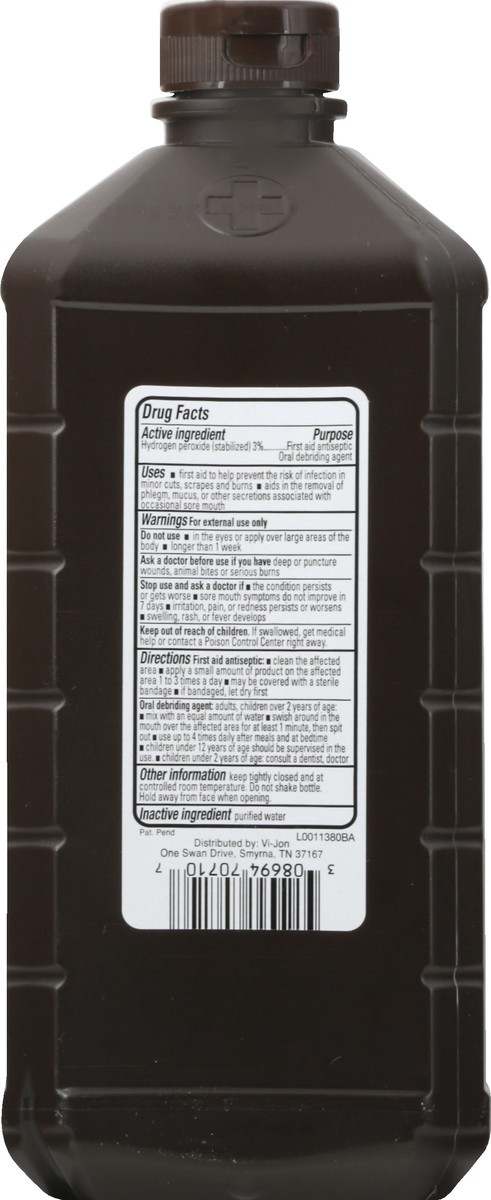 Active Ingredients: Hydrogen Peroxide (Stabilized) (3 %), First Aid Antiseptic. Oral Debriding Agent. Inactive Ingredients: Purifed Water.