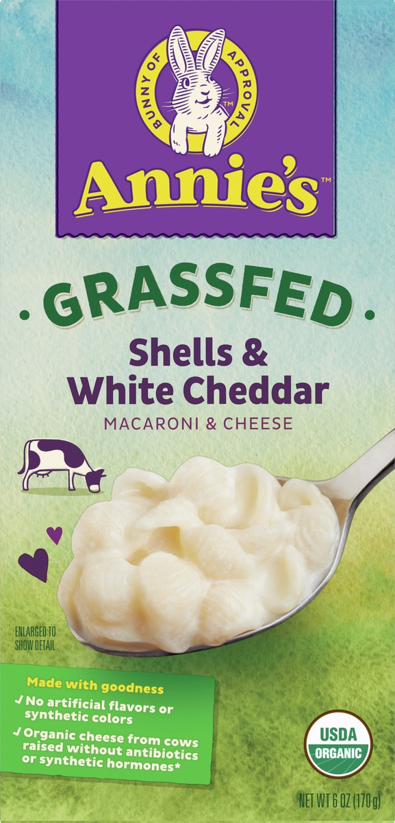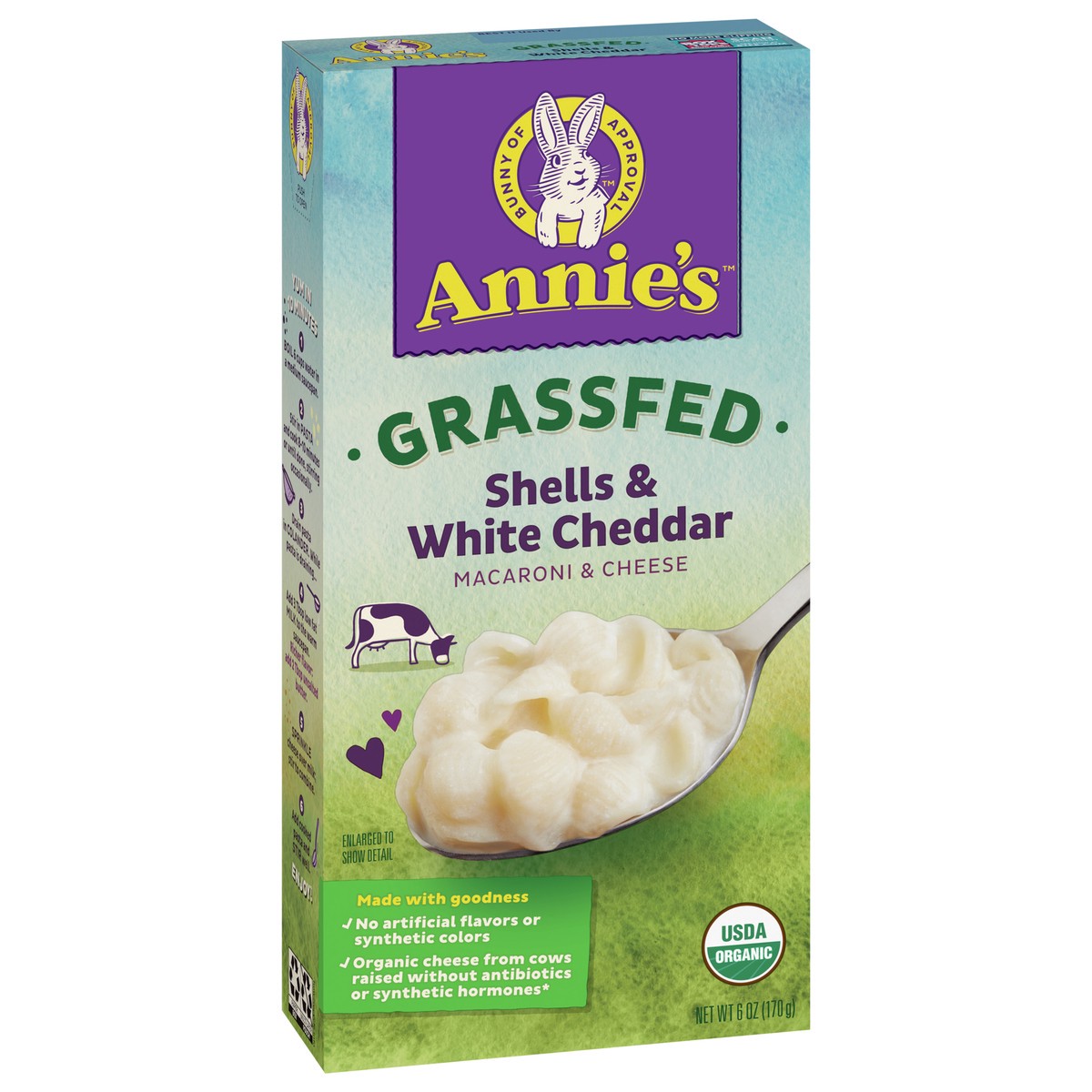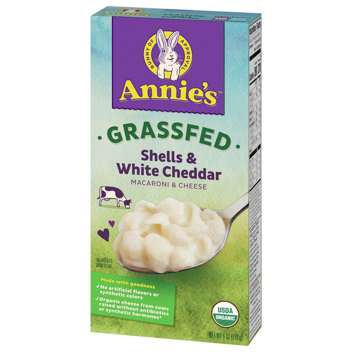 Annie's Organic Grassfed Shells and White Cheddar is a rich and creamy mac and cheese with pasta shells and white cheddar. Simply boil, drain, stir, then add milk and the cheese packet. Carefully craf…