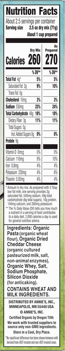 Organic Pasta (Organic Wheat Flour), Organic Dried Cheddar Cheese (Organic Cultured Pasteurized Milk, Salt, Non-Animal Enzymes), Organic Whey, Salt, Sodium Phosphate, Silicon Dioxide (for Anticaking).